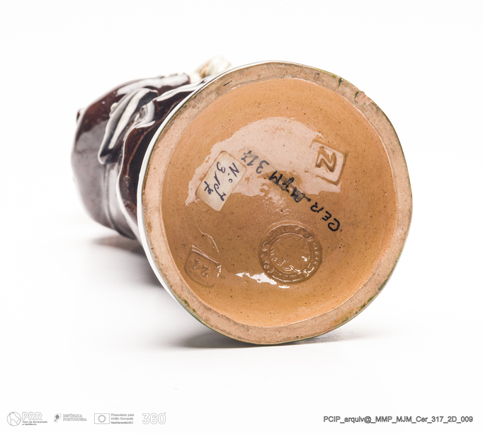 Matéria/Técnica: Barro vidrado; Cronologia: 1908; Autoria: Manuel Gustavo Bordalo Pinheiro; Dimensões: Comprimento: 9,1 x Altura: 23,8 x Largura: 8,4 cm.