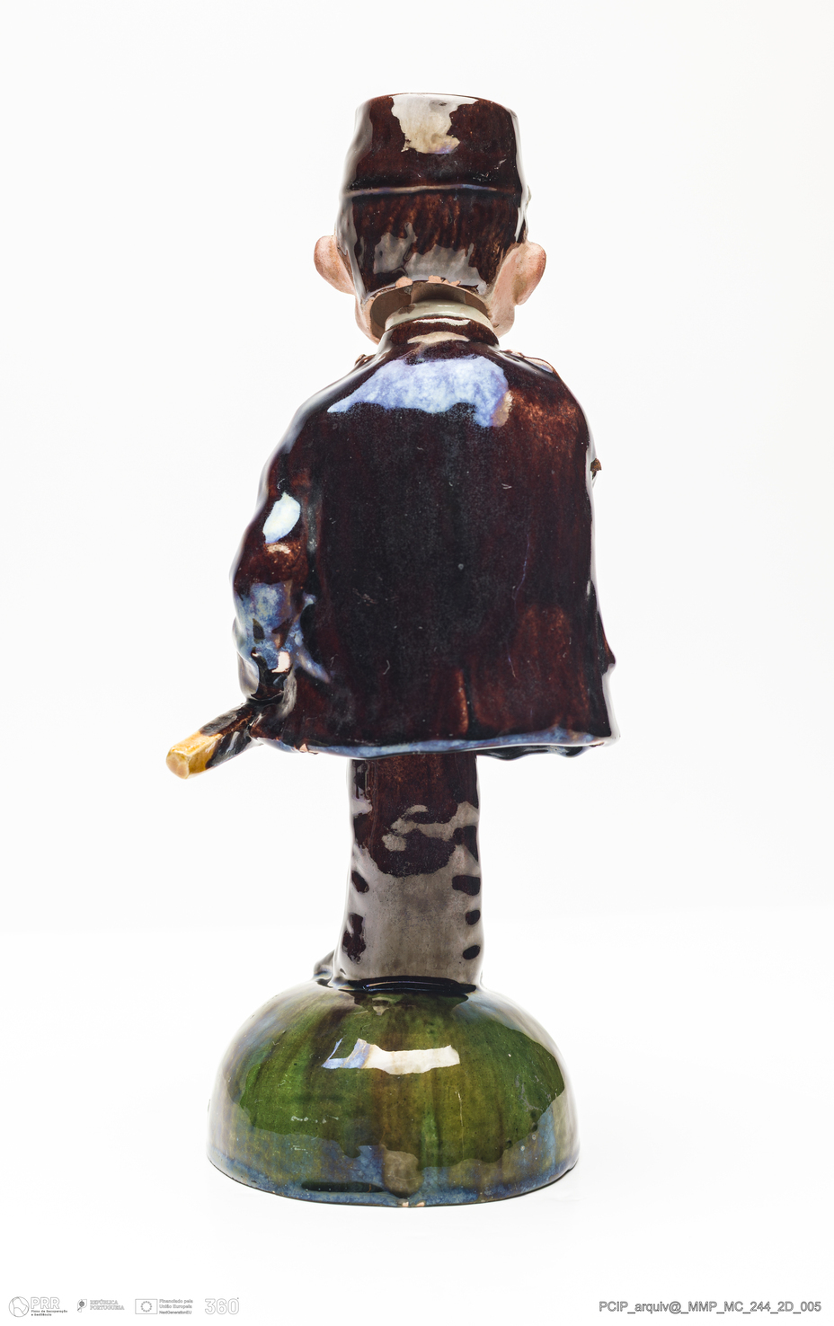 Matéria/Técnica: Barro vermelho modelado e moldado. Vidrado polícromo: branco de estanho, azul de cobalto, castanho de manganês, amarelo de ferro e verde cobre. Aplicação de pintura polícroma a frio nas mãos e rosto; Cronologia: 1901; Autoria: Rafael Bordalo Pinheiro / Fábrica de Faianças das Caldas da Rainha, Portugal; Dimensões (cm): Altura: 24; Largura: 10,8; Comprimento: 9,8.