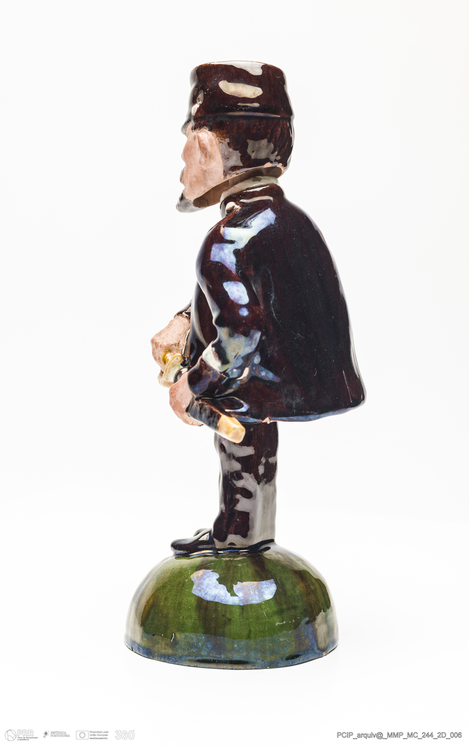 Matéria/Técnica: Barro vermelho modelado e moldado. Vidrado polícromo: branco de estanho, azul de cobalto, castanho de manganês, amarelo de ferro e verde cobre. Aplicação de pintura polícroma a frio nas mãos e rosto; Cronologia: 1901; Autoria: Rafael Bordalo Pinheiro / Fábrica de Faianças das Caldas da Rainha, Portugal; Dimensões (cm): Altura: 24; Largura: 10,8; Comprimento: 9,8.