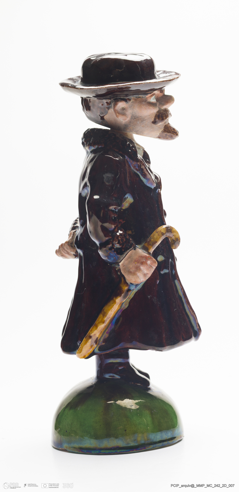 Matéria/Técnica: Barro vermelho moldado. Vidrado polícromo: verde, preto, castanho, branco e ocre. Rosto e mãos pintados a frio; Cronologia: 1906; Autoria: Rafael Bordalo Pinheiro / Fábrica Bordalo Pinheiro, Caldas da Rainha, Portugal; Dimensões (cm): Altura: 24,1; Largura: 9,1; Comprimento: 9,3.