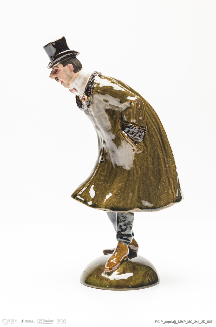 Matéria/Técnica: Barro vermelho moldado. Vidrado polícromo: castanho, preto, amarelo, branco e vermelho. Rosto pintado a frio; Cronologia: 1908-1924; Autoria: Rafael Bordalo Pinheiro / Fábrica de Faianças das Caldas da Rainha, Portugal; Dimensões (cm): Altura: 20,3; Largura: 8,1; Comprimento: 12,5.