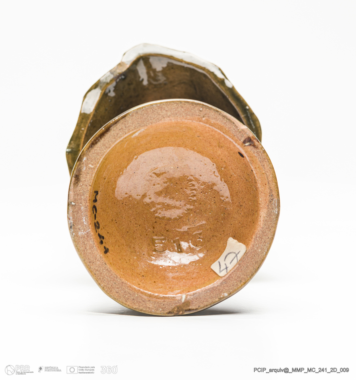 Matéria/Técnica: Barro vermelho moldado. Vidrado polícromo: castanho, preto, amarelo, branco e vermelho. Rosto pintado a frio; Cronologia: 1908-1924; Autoria: Rafael Bordalo Pinheiro / Fábrica de Faianças das Caldas da Rainha, Portugal; Dimensões (cm): Altura: 20,3; Largura: 8,1; Comprimento: 12,5.