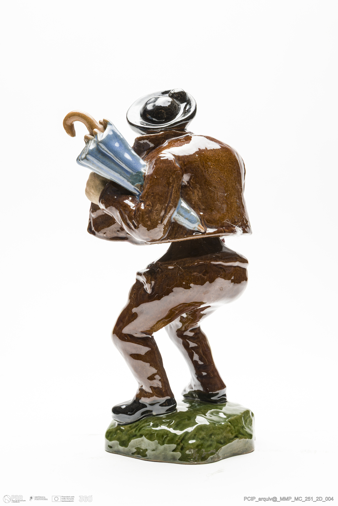 Matéria/Técnica: Barro vermelho moldado e modelado. Vidrado polícromo verde, castanho, vermelho, azul e camurça. Mãos e rosto não vidrados; Cronologia: 1862-1901; Autoria: José Alves Cunha Sucessor; Dimensões (cm): Altura: 20; Largura: 11.