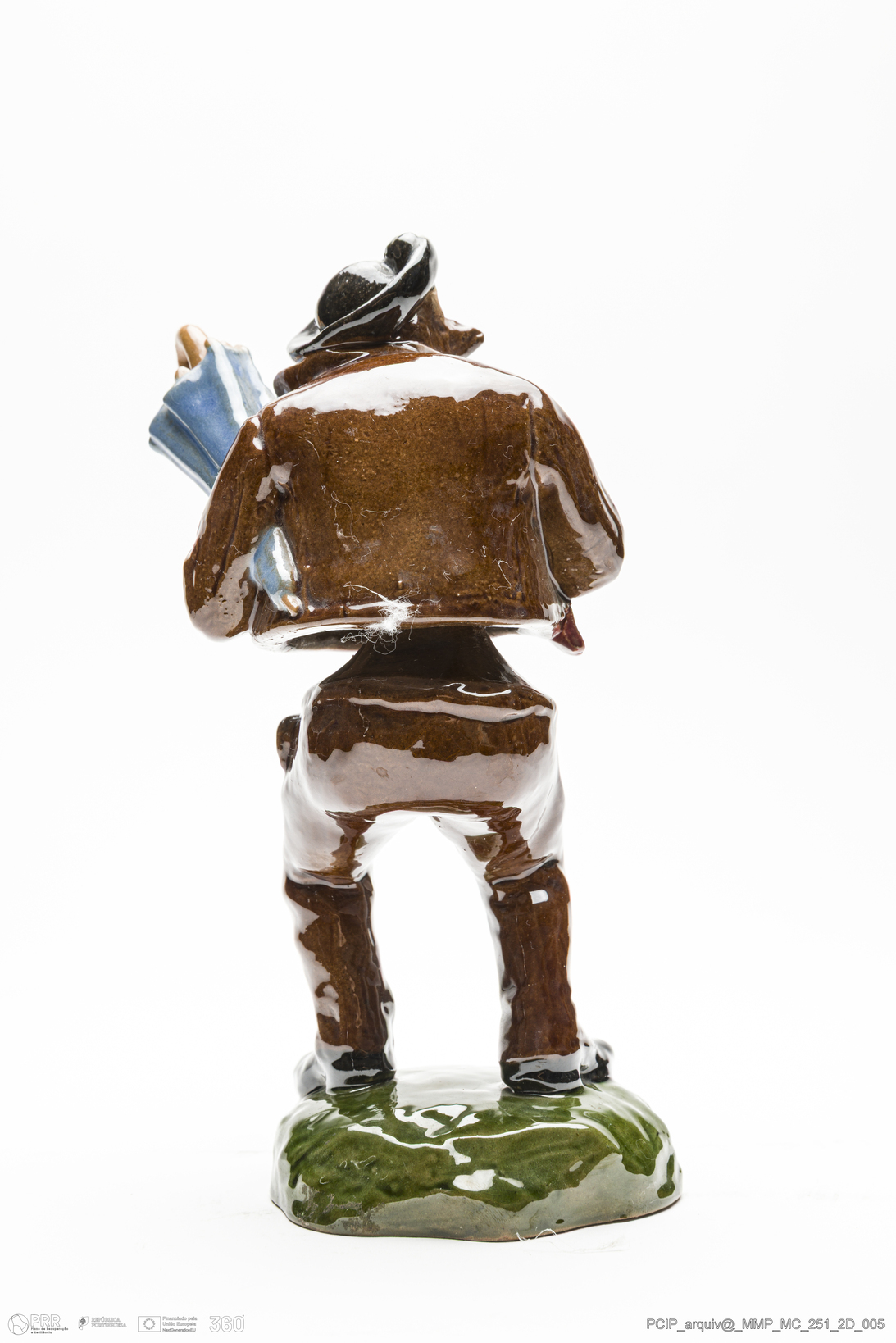 Matéria/Técnica: Barro vermelho moldado e modelado. Vidrado polícromo verde, castanho, vermelho, azul e camurça. Mãos e rosto não vidrados; Cronologia: 1862-1901; Autoria: José Alves Cunha Sucessor; Dimensões (cm): Altura: 20; Largura: 11.