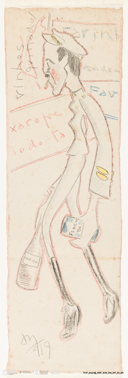 Matéria/Técnica: Lápis e lápis de cor sobre papel; Cronologia: 1919; Autoria: António Montês; Dimensões: 34,3 x 11 cm.