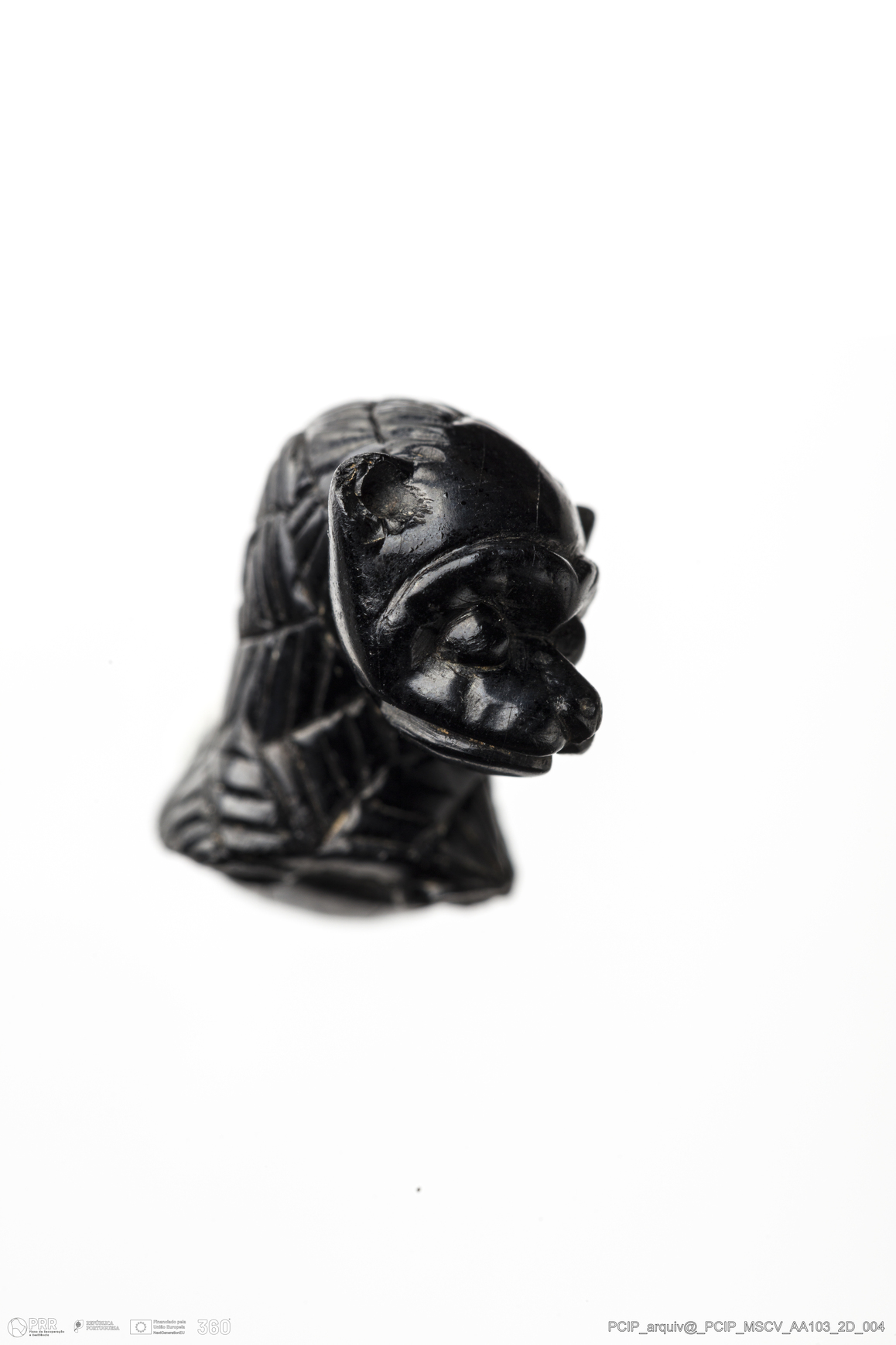 Matéria/Técnica: Azeviche; Cronologia: Século XVI-XVII; Autoria: Desconhecida; Dimensões: Largura: 22mm Altura / Espessura: 10mm Comprimento / Profundidade: 15mm.
