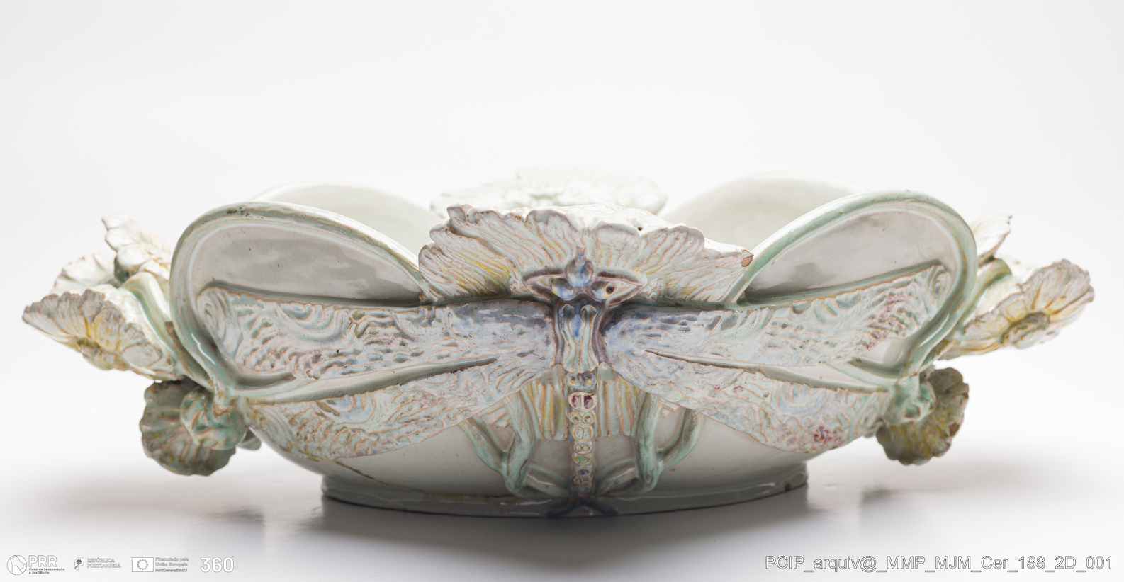 Matéria/Técnica: Barro vidrado policromado; Cronologia: 1901; Autoria: Rafael Bordalo Pinheiro; Dimensões: Comprimento: 44,2 x Altura: 13,7 x Largura: 35,9 cm.