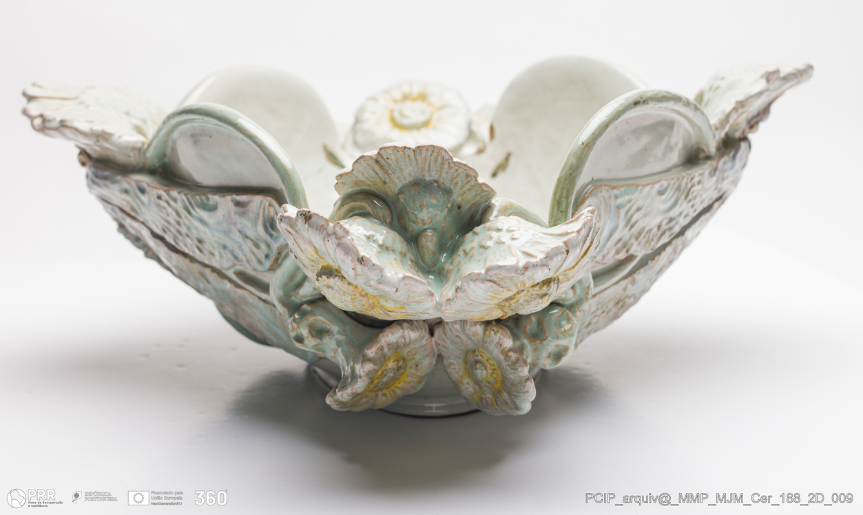 Matéria/Técnica: Barro vidrado policromado; Cronologia: 1901; Autoria: Rafael Bordalo Pinheiro; Dimensões: Comprimento: 44,2 x Altura: 13,7 x Largura: 35,9 cm.