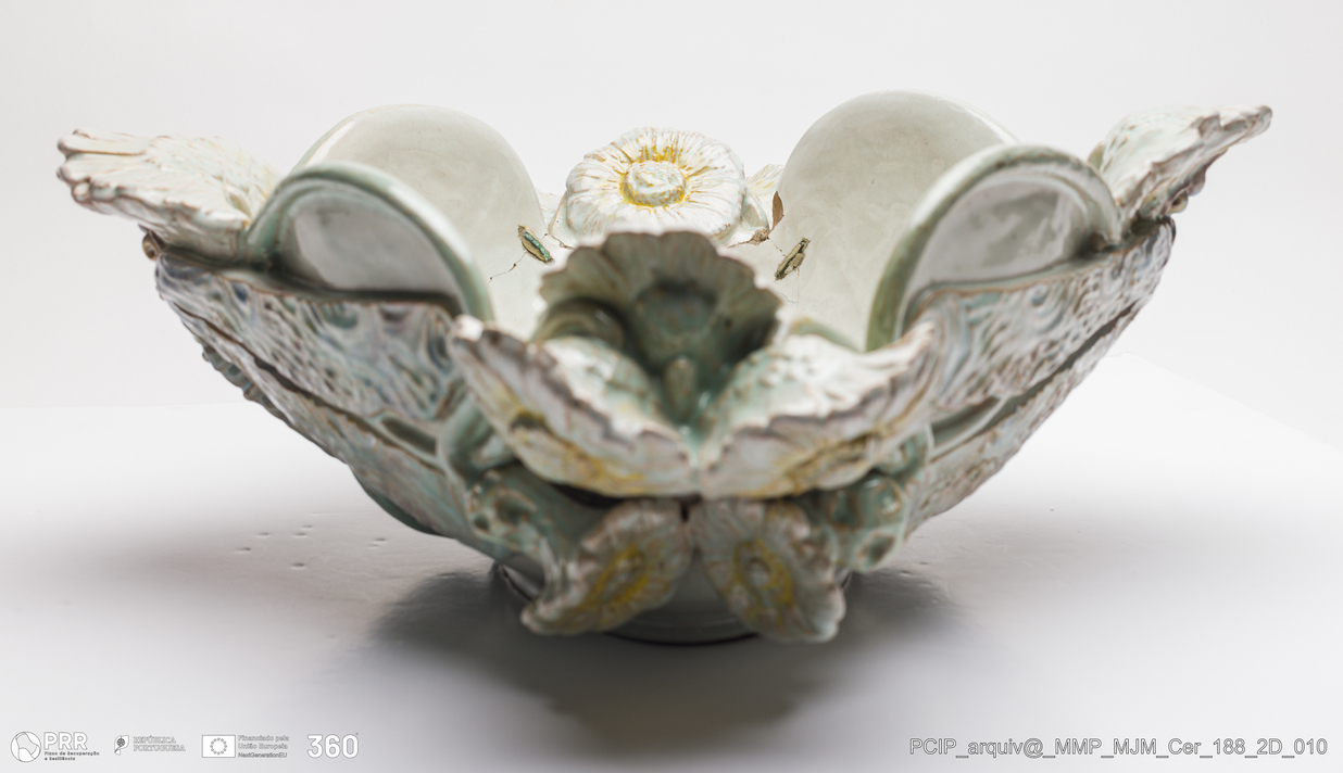 Matéria/Técnica: Barro vidrado policromado; Cronologia: 1901; Autoria: Rafael Bordalo Pinheiro; Dimensões: Comprimento: 44,2 x Altura: 13,7 x Largura: 35,9 cm.
