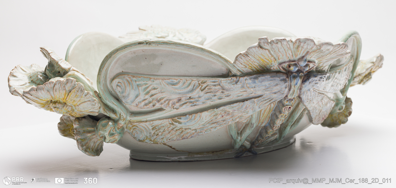 Matéria/Técnica: Barro vidrado policromado; Cronologia: 1901; Autoria: Rafael Bordalo Pinheiro; Dimensões: Comprimento: 44,2 x Altura: 13,7 x Largura: 35,9 cm.