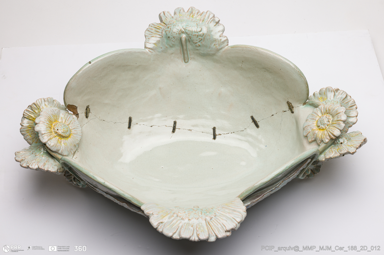 Matéria/Técnica: Barro vidrado policromado; Cronologia: 1901; Autoria: Rafael Bordalo Pinheiro; Dimensões: Comprimento: 44,2 x Altura: 13,7 x Largura: 35,9 cm.