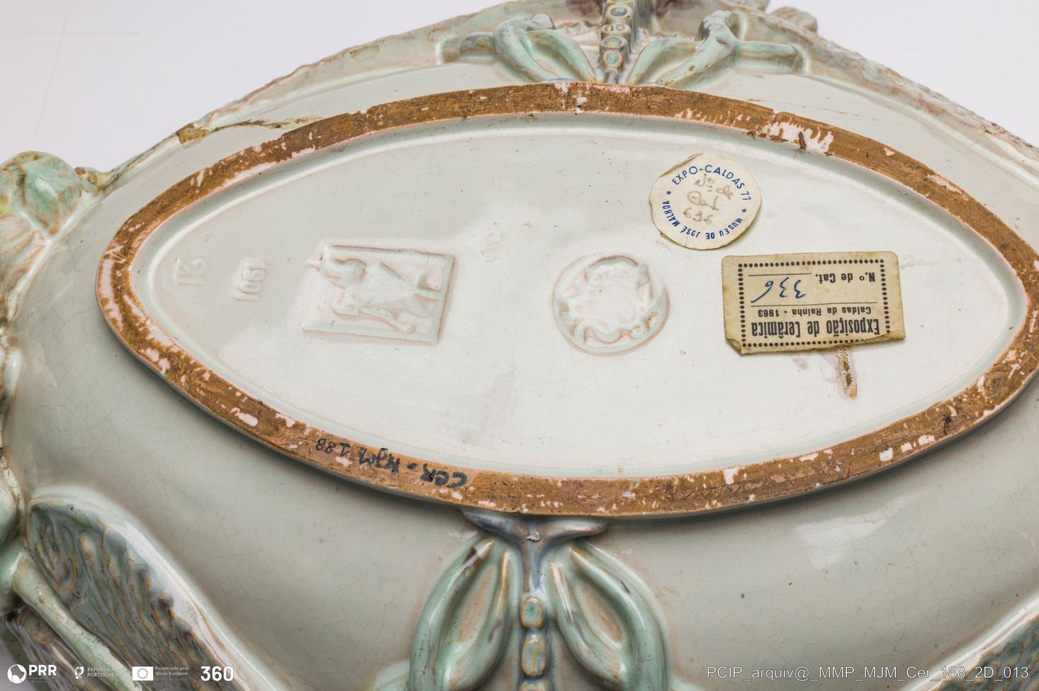 Matéria/Técnica: Barro vidrado policromado; Cronologia: 1901; Autoria: Rafael Bordalo Pinheiro; Dimensões: Comprimento: 44,2 x Altura: 13,7 x Largura: 35,9 cm.
