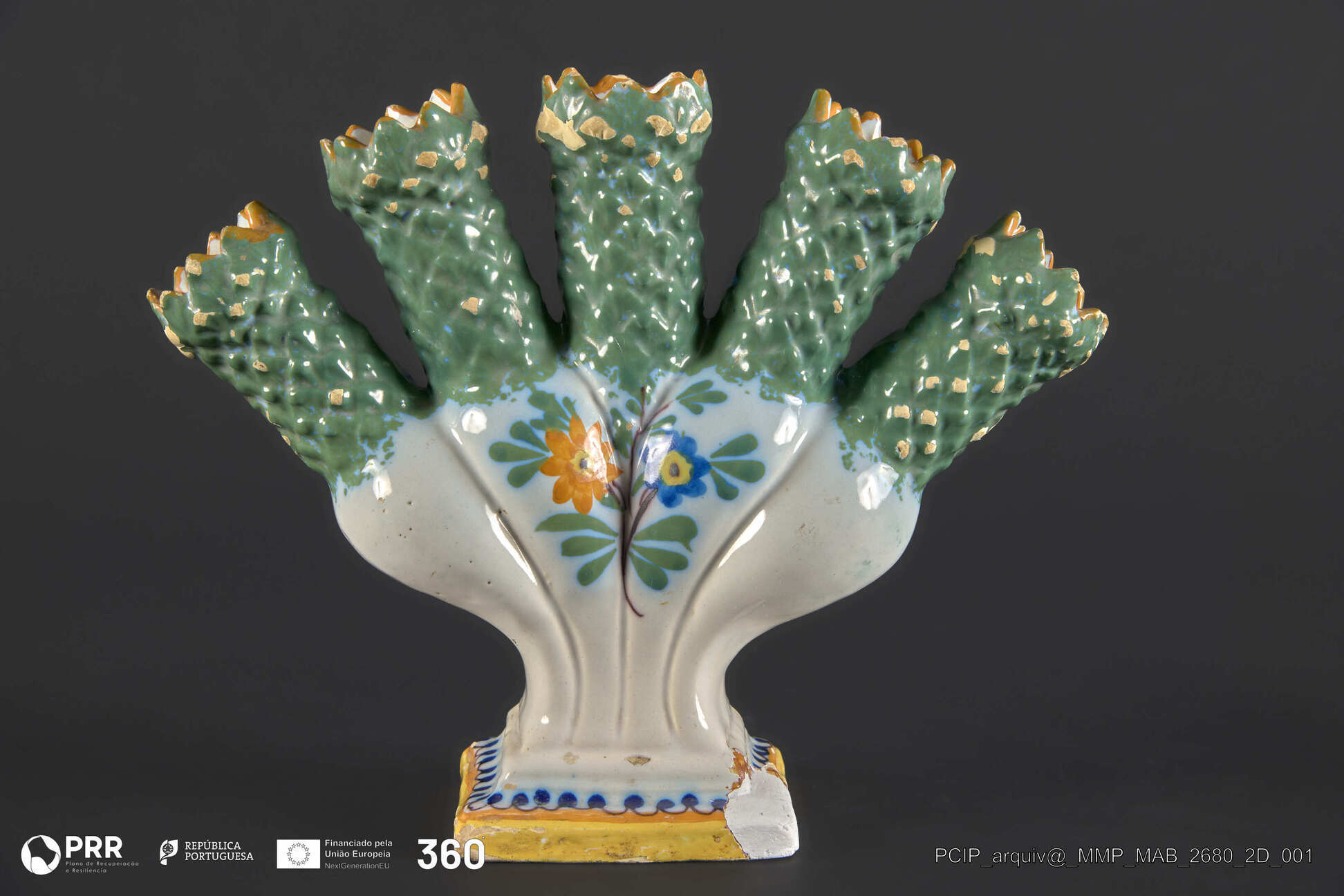 Matéria/Técnica: Peça moldada, vidrada e pintada a verde, azul, laranja ; Cronologia: Desconhecida; Autoria: Desconhecida; Dimensões: Desconhecidas.