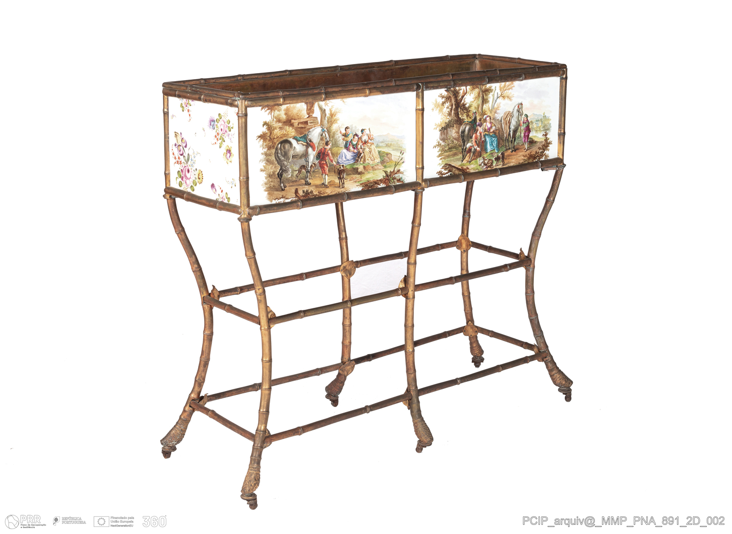 Matéria/Técnica: Metal, porcelana, tinta; Cronologia: Século XIX; Autoria: Desconhecida; Dimensões (cm): Altura: 96,5; Largura: 38; Comprimento: 112.