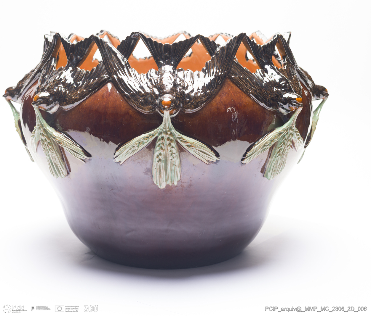 Matéria/Técnica: Barro vermelho modelado e moldado. Vidrado polícromo: tons de castanho manganês, amarelo de ferro e verde de cobre com estanho; Cronologia: 1849-1901; Autoria: José Alves Cunha / Fábrica de José Alves Cunha, Caldas da Rainha, Portugal; Dimensões (cm): Altura: 35,5; Diâmetro: 44,5.