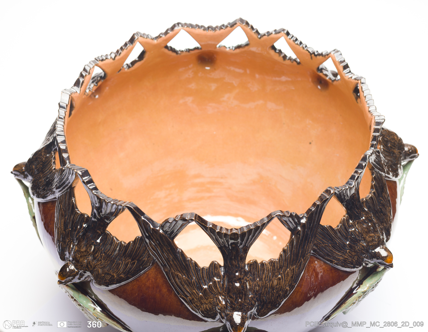 Matéria/Técnica: Barro vermelho modelado e moldado. Vidrado polícromo: tons de castanho manganês, amarelo de ferro e verde de cobre com estanho; Cronologia: 1849-1901; Autoria: José Alves Cunha / Fábrica de José Alves Cunha, Caldas da Rainha, Portugal; Dimensões (cm): Altura: 35,5; Diâmetro: 44,5.