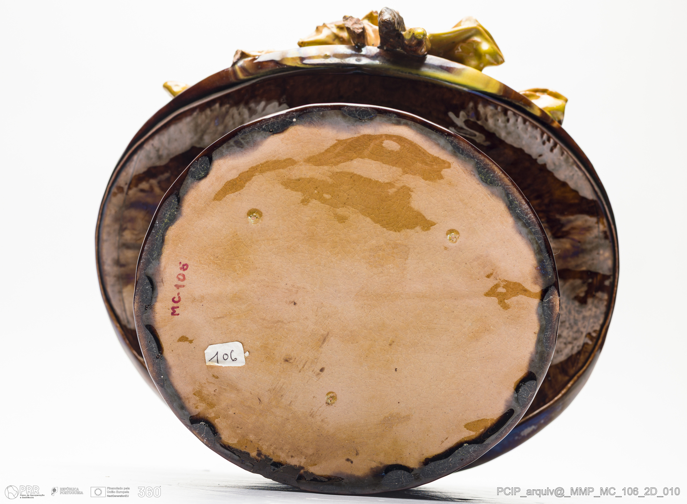 Matéria/Técnica: Barro vermelho modelado e moldado. Vidrado polícromo: castanho escuro e mel e beje; Cronologia: 1905; Autoria: Rafael Bordalo Pinheiro / Fábrica de Faianças das Caldas da Rainha, Portugal; Dimensões (cm): Altura: 17; Largura: 30.