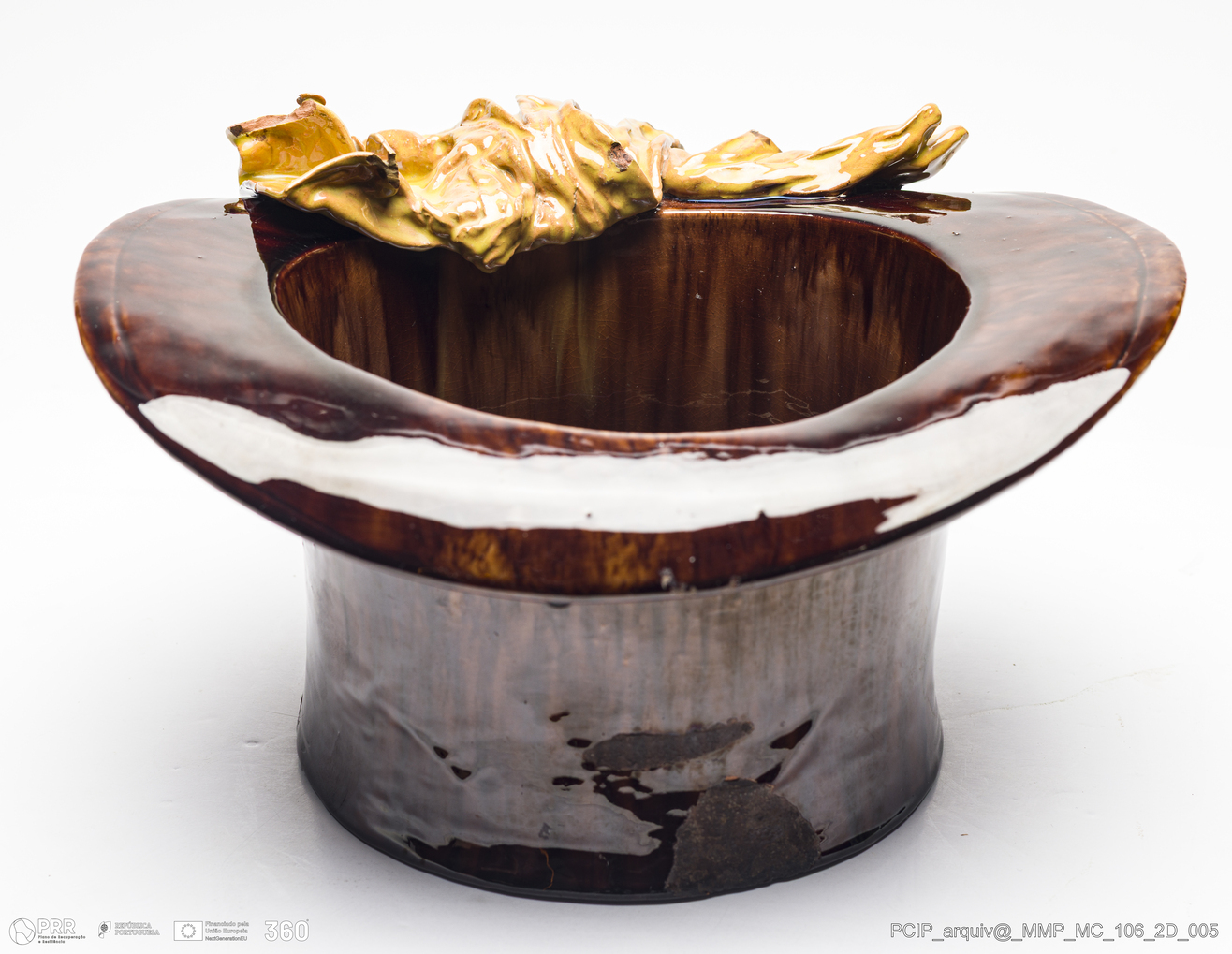 Matéria/Técnica: Barro vermelho modelado e moldado. Vidrado polícromo: castanho escuro e mel e beje; Cronologia: 1905; Autoria: Rafael Bordalo Pinheiro / Fábrica de Faianças das Caldas da Rainha, Portugal; Dimensões (cm): Altura: 17; Largura: 30.