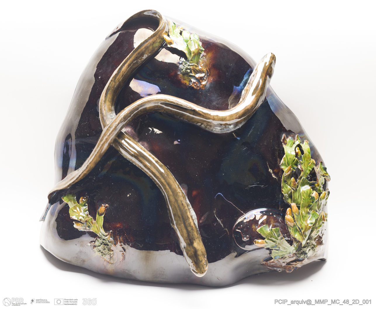 Matéria/Técnica: Barro vermelho modelado e moldado. Vidrado polícromo: preto, castanha escuro e mel, verde; Cronologia: 1889; Autoria: Rafael Bordalo Pinheiro / Fábrica de Faianças das Caldas da Rainha, Portugal; Dimensões (cm): Altura: 40; Largura: 44,5; Comprimento: 17.