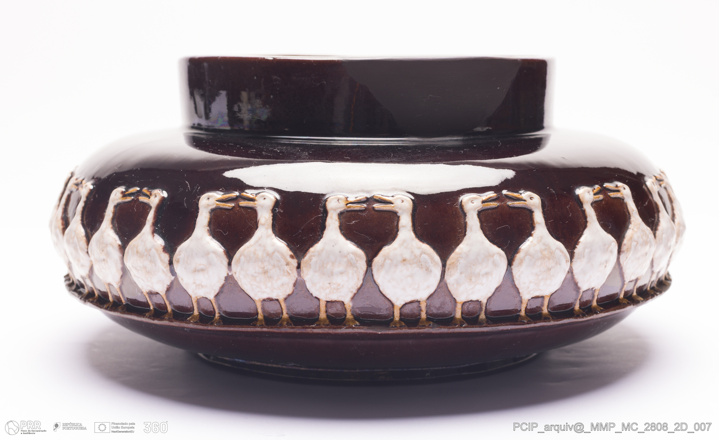 Matéria/Técnica: Barro moldado. Vidrado polícromo: castanho e branco; Cronologia: 1907; Autoria: Manuel Gustavo Bordalo Pinheiro / Fábrica de Faianças das Caldas da Rainha, Portugal; Dimensões (cm): Altura: 13; Diâmetro: 27.