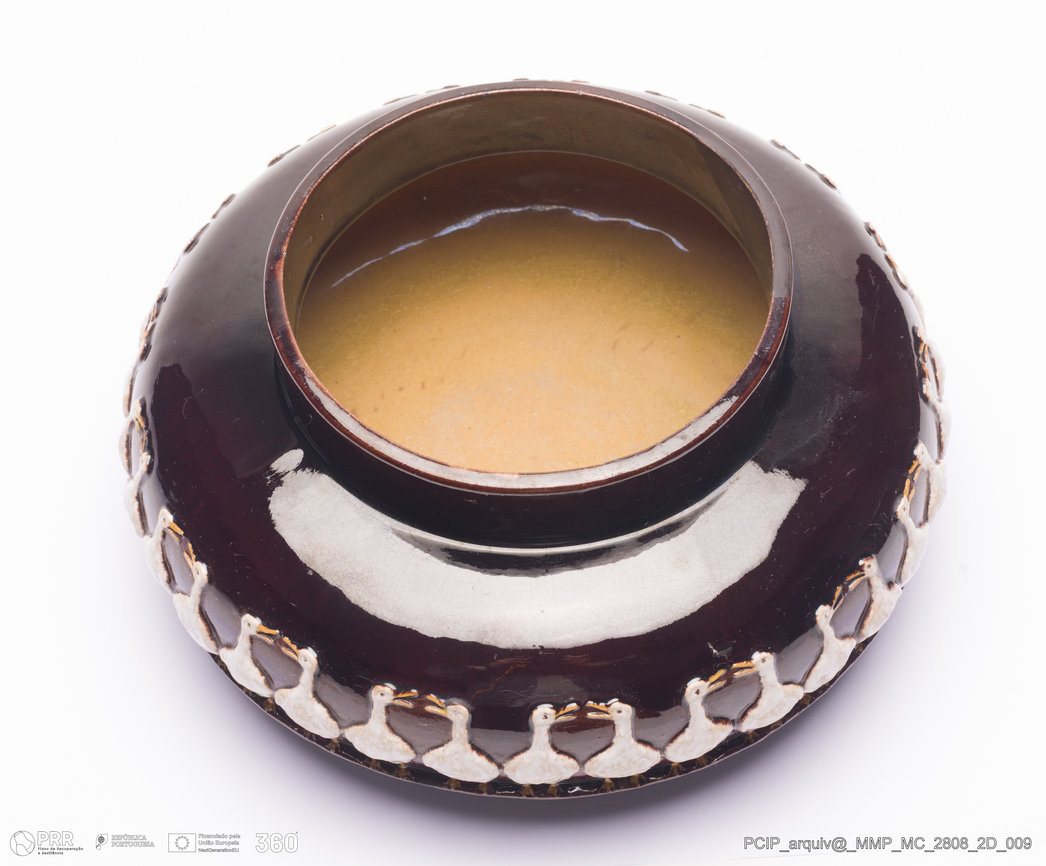 Matéria/Técnica: Barro moldado. Vidrado polícromo: castanho e branco; Cronologia: 1907; Autoria: Manuel Gustavo Bordalo Pinheiro / Fábrica de Faianças das Caldas da Rainha, Portugal; Dimensões (cm): Altura: 13; Diâmetro: 27.