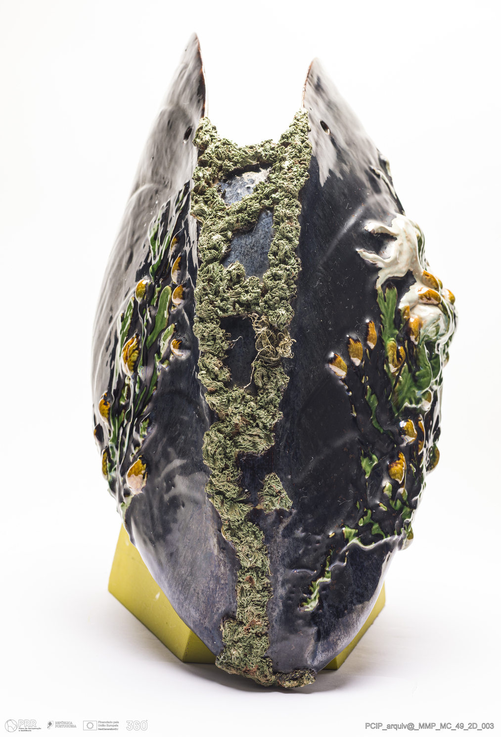 Matéria/Técnica: Barro vermelho moldado e modelado. Vidrado polícromo: preto, castanho escuro e mel, verde, camurça e branco. Musgados e escorridos; Cronologia: 1896; Autoria: Rafael Bordalo Pinheiro / Fábrica de Faianças das Caldas da Rainha, Portugal; Dimensões (cm): Altura: 52; Largura: 27; Comprimento: 38.