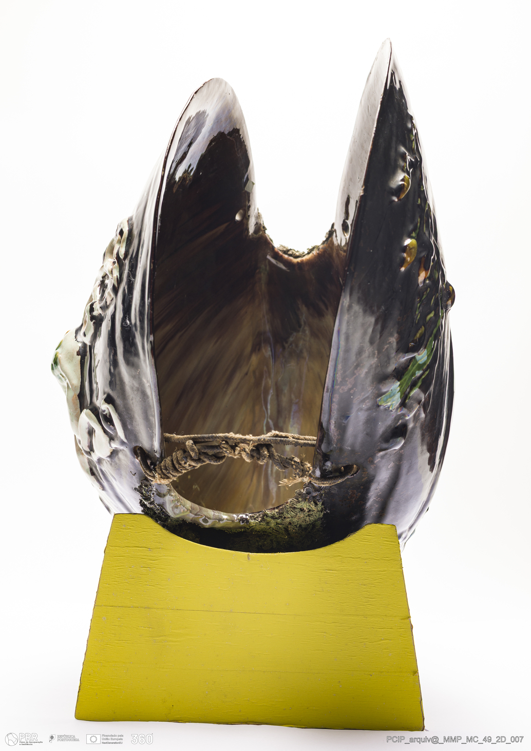 Matéria/Técnica: Barro vermelho moldado e modelado. Vidrado polícromo: preto, castanho escuro e mel, verde, camurça e branco. Musgados e escorridos; Cronologia: 1896; Autoria: Rafael Bordalo Pinheiro / Fábrica de Faianças das Caldas da Rainha, Portugal; Dimensões (cm): Altura: 52; Largura: 27; Comprimento: 38.