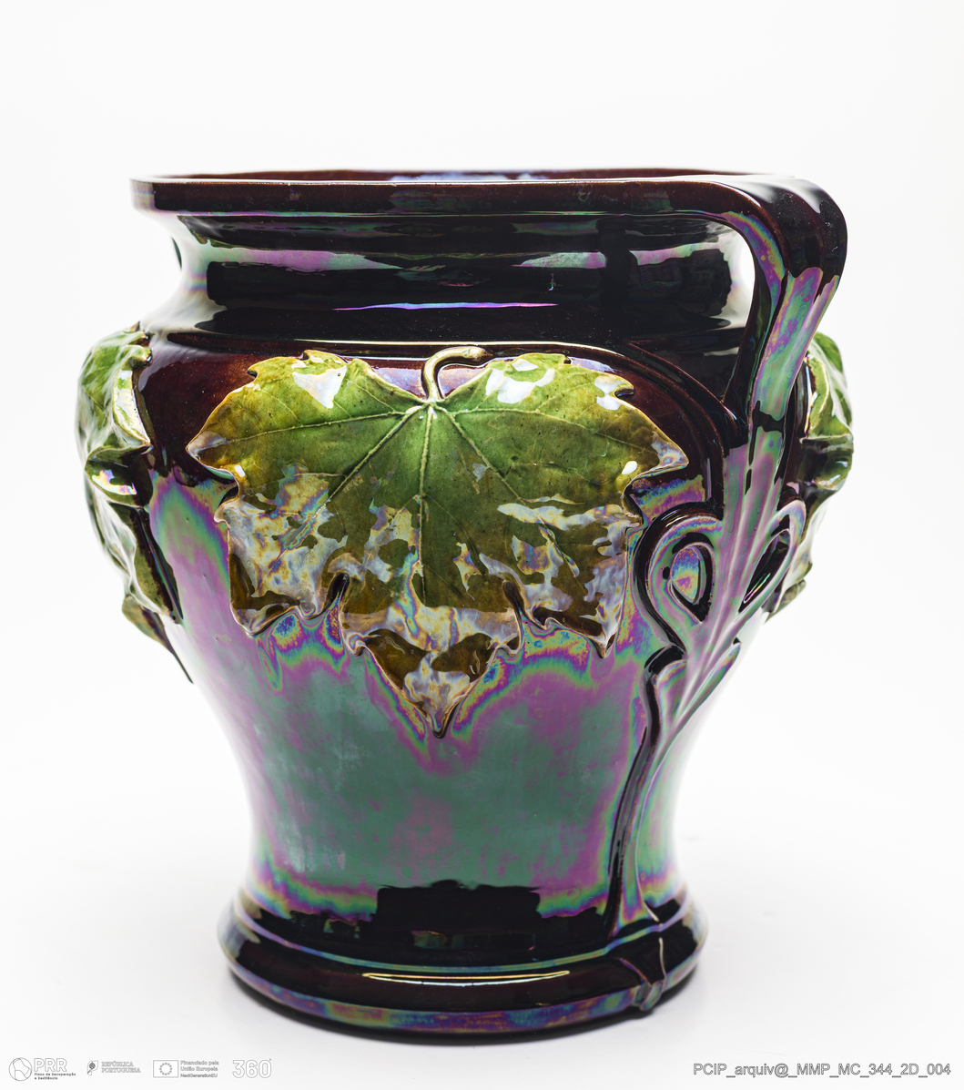 Matéria/Técnica: Barro vermelho rodado e moldado. Vidrado polícromo: castanho escuro e verde; Cronologia: 1905-1922; Autoria: Manuel Gustavo Bordalo Pinheiro / Fábrica Bordalo Pinheiro, Caldas da Rainha, Portugal; Dimensões (cm): Altura: 24; Largura: 29; Comprimento: 25.