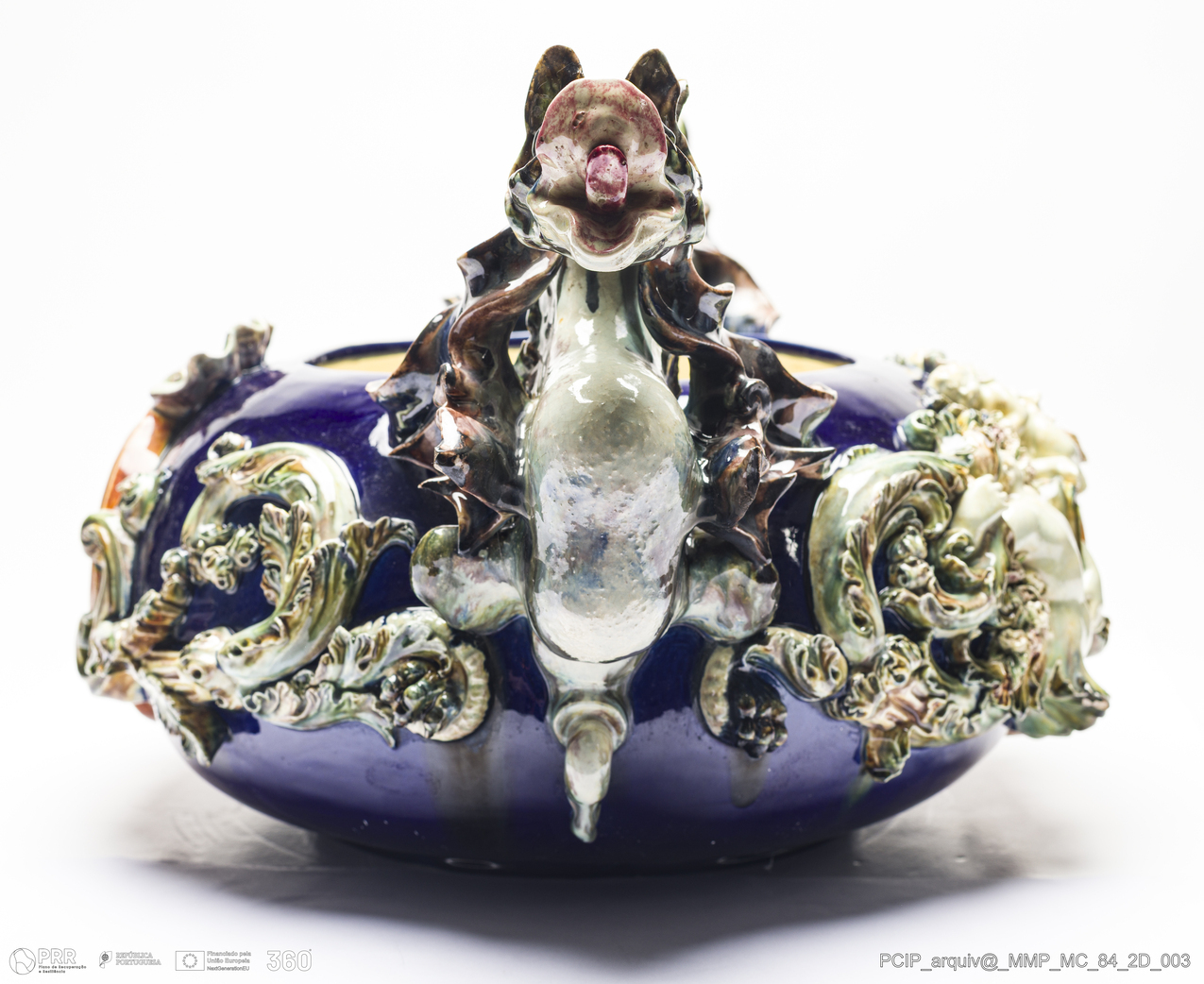 Matéria/Técnica: Barro branco modelado e moldado. Vidrado polícromo: azul, verde, castanho escuro e mel e camurça; Cronologia: 1900; Autoria: Rafael Bordalo Pinheiro / Fábrica de Faianças das Caldas da Rainha, Portugal; Dimensões (cm): Altura: 26,5; Largura: 33; Comprimento: 53.