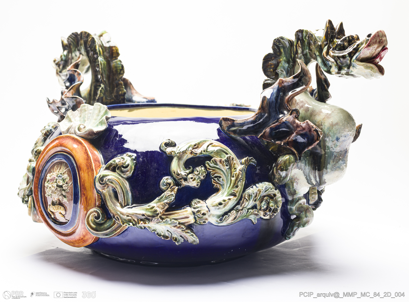 Matéria/Técnica: Barro branco modelado e moldado. Vidrado polícromo: azul, verde, castanho escuro e mel e camurça; Cronologia: 1900; Autoria: Rafael Bordalo Pinheiro / Fábrica de Faianças das Caldas da Rainha, Portugal; Dimensões (cm): Altura: 26,5; Largura: 33; Comprimento: 53.