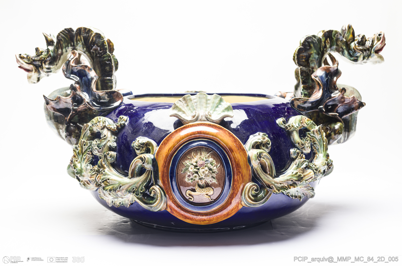 Matéria/Técnica: Barro branco modelado e moldado. Vidrado polícromo: azul, verde, castanho escuro e mel e camurça; Cronologia: 1900; Autoria: Rafael Bordalo Pinheiro / Fábrica de Faianças das Caldas da Rainha, Portugal; Dimensões (cm): Altura: 26,5; Largura: 33; Comprimento: 53.