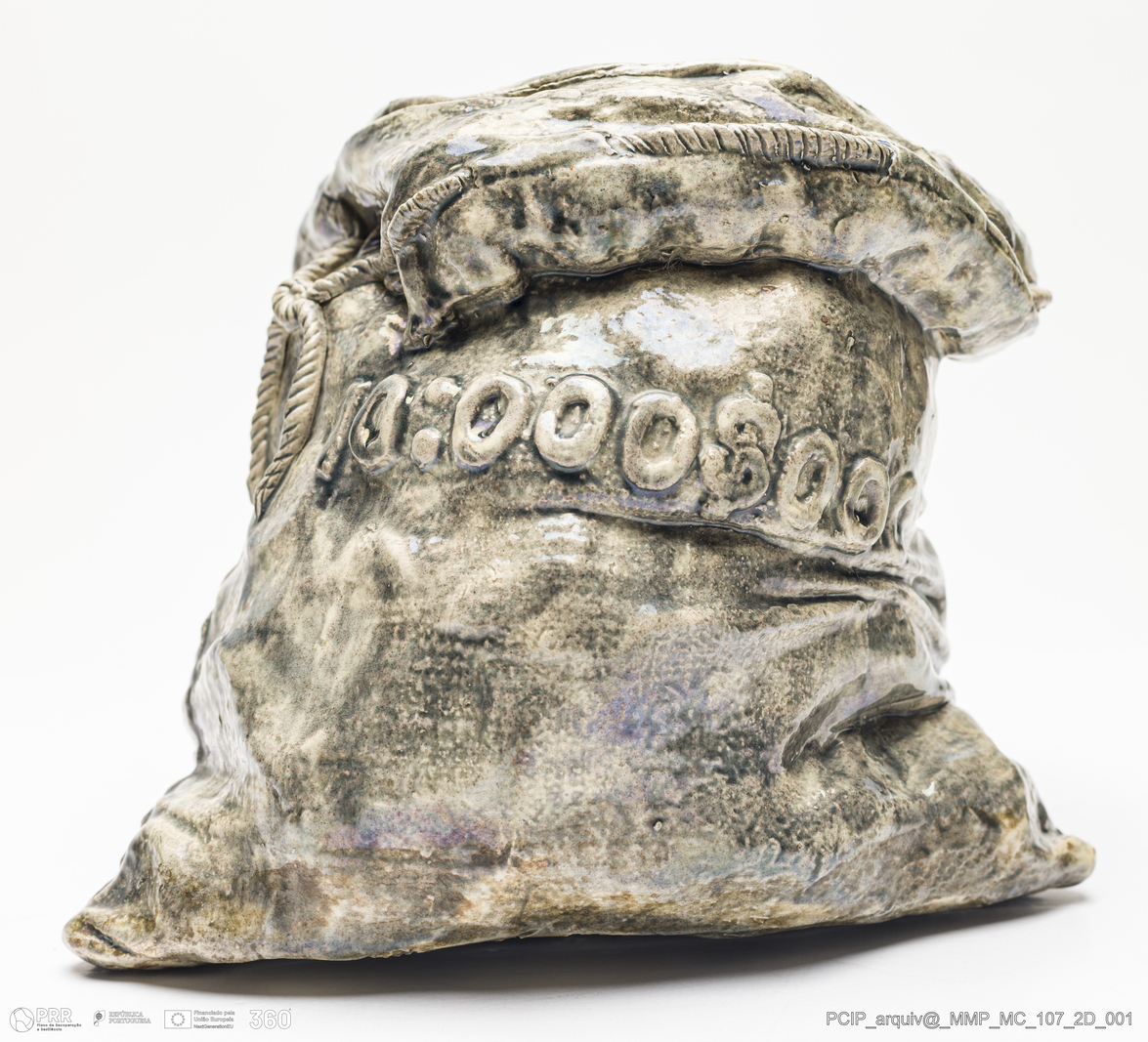 Matéria/Técnica: Barro branco modelado. Vidrado polícromo: cinzento e branco; Cronologia: 1905; Autoria: Rafael Bordalo Pinheiro / Fábrica de Faianças das Caldas da Rainha, Portugal; Dimensões (cm): Altura: 17,5; Largura: 21.