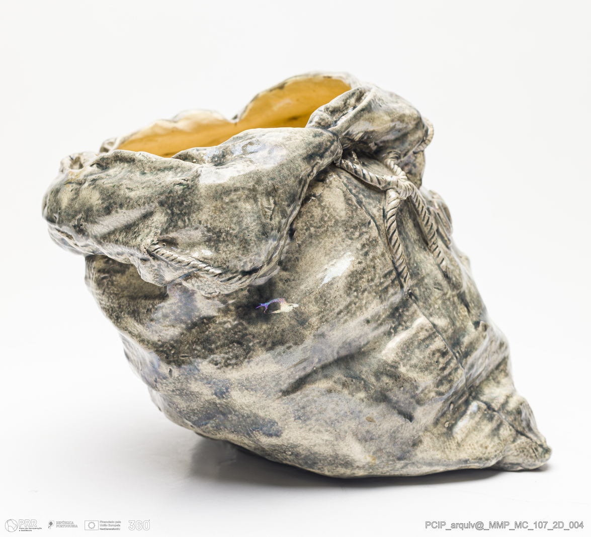 Matéria/Técnica: Barro branco modelado. Vidrado polícromo: cinzento e branco; Cronologia: 1905; Autoria: Rafael Bordalo Pinheiro / Fábrica de Faianças das Caldas da Rainha, Portugal; Dimensões (cm): Altura: 17,5; Largura: 21.