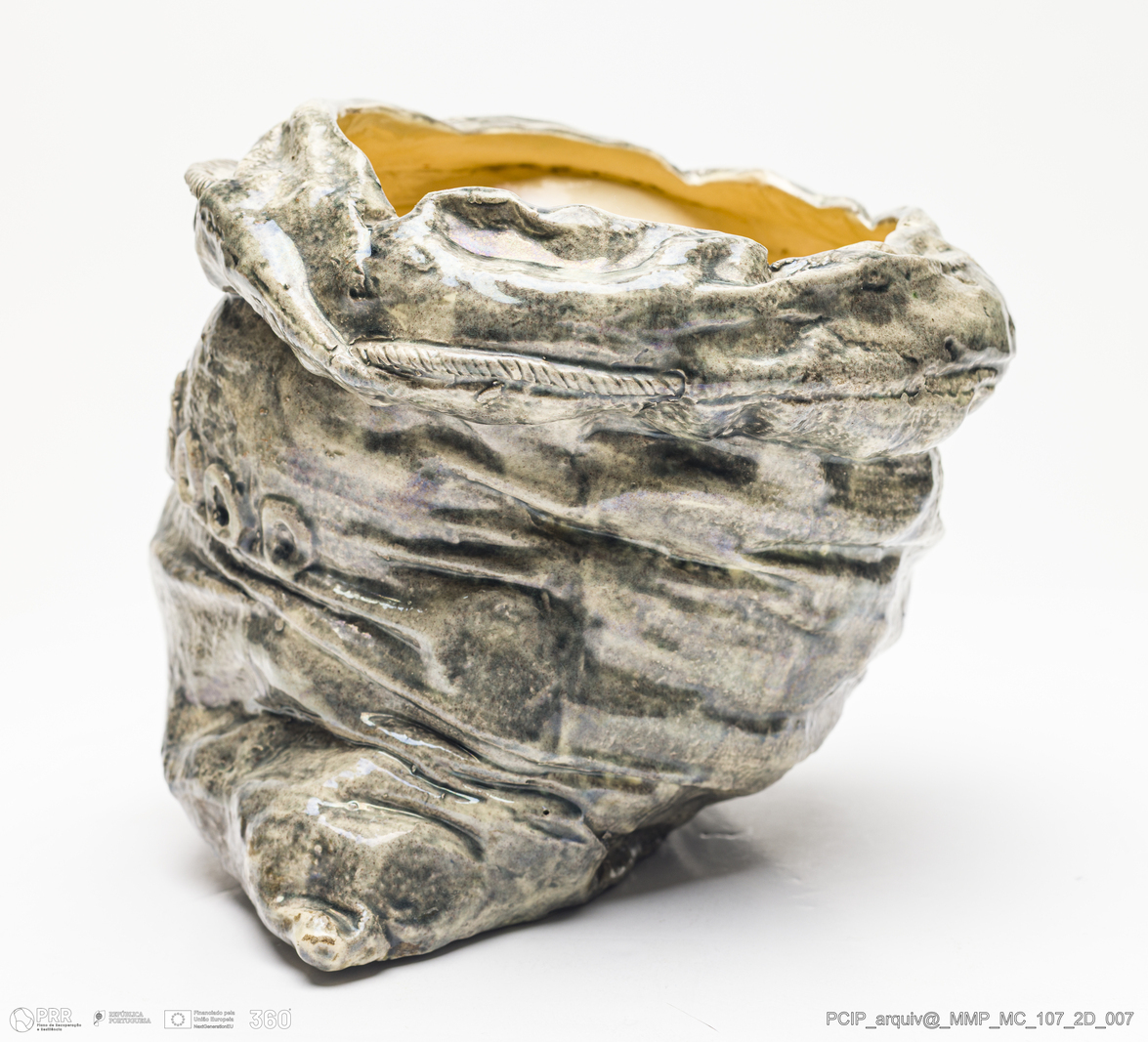 Matéria/Técnica: Barro branco modelado. Vidrado polícromo: cinzento e branco; Cronologia: 1905; Autoria: Rafael Bordalo Pinheiro / Fábrica de Faianças das Caldas da Rainha, Portugal; Dimensões (cm): Altura: 17,5; Largura: 21.