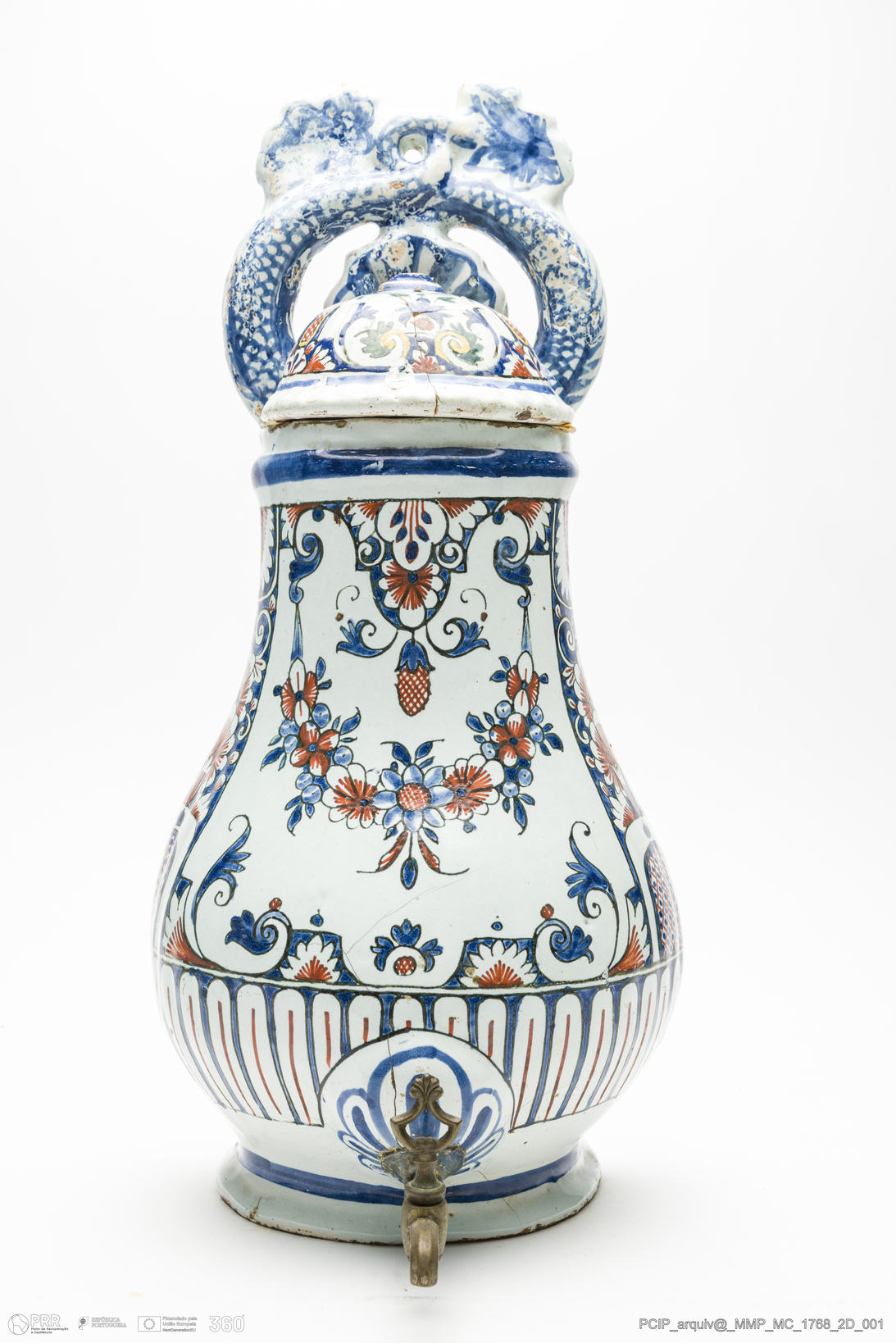 Matéria/Técnica: Faiança moldada. Vidrado polícromo branco, azul, vermelho, verde e amarelo; Cronologia: século XVII; Autoria: Desconhecido. Rouen; Dimensões (cm): Altura: 39,3; Largura: 18,3; Comprimento: 17.