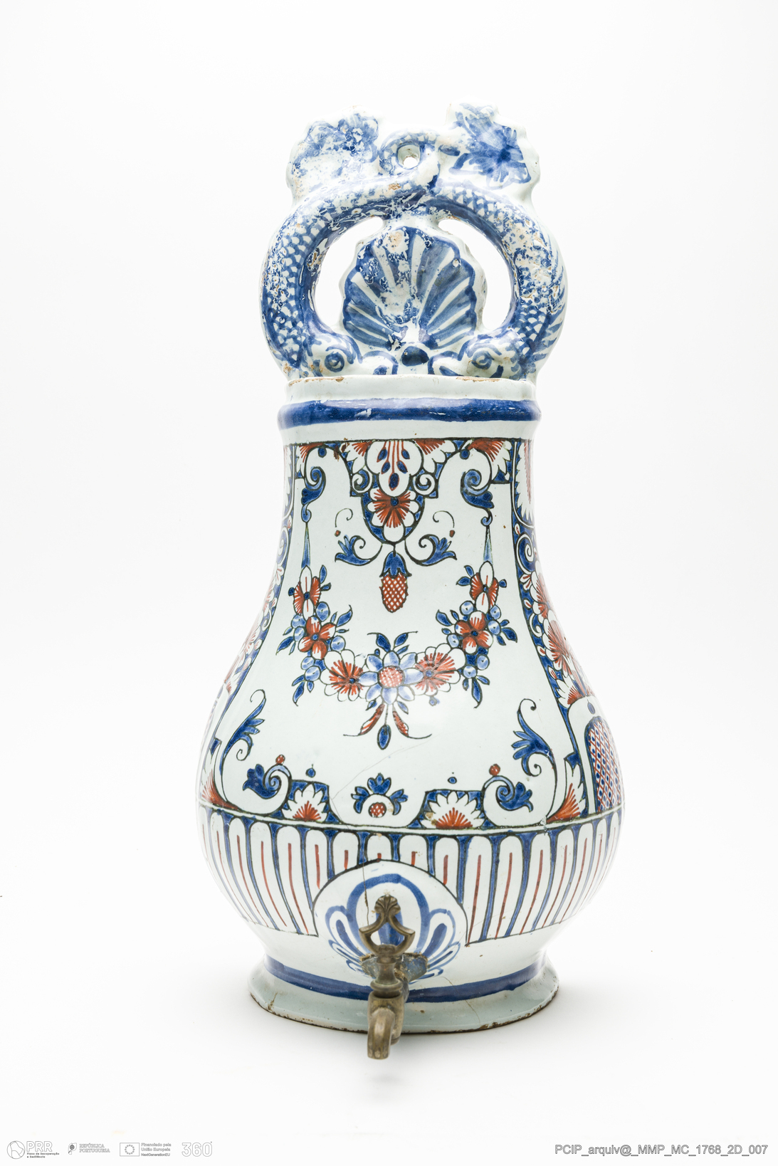Matéria/Técnica: Faiança moldada. Vidrado polícromo branco, azul, vermelho, verde e amarelo; Cronologia: século XVII; Autoria: Desconhecido. Rouen; Dimensões (cm): Altura: 39,3; Largura: 18,3; Comprimento: 17.