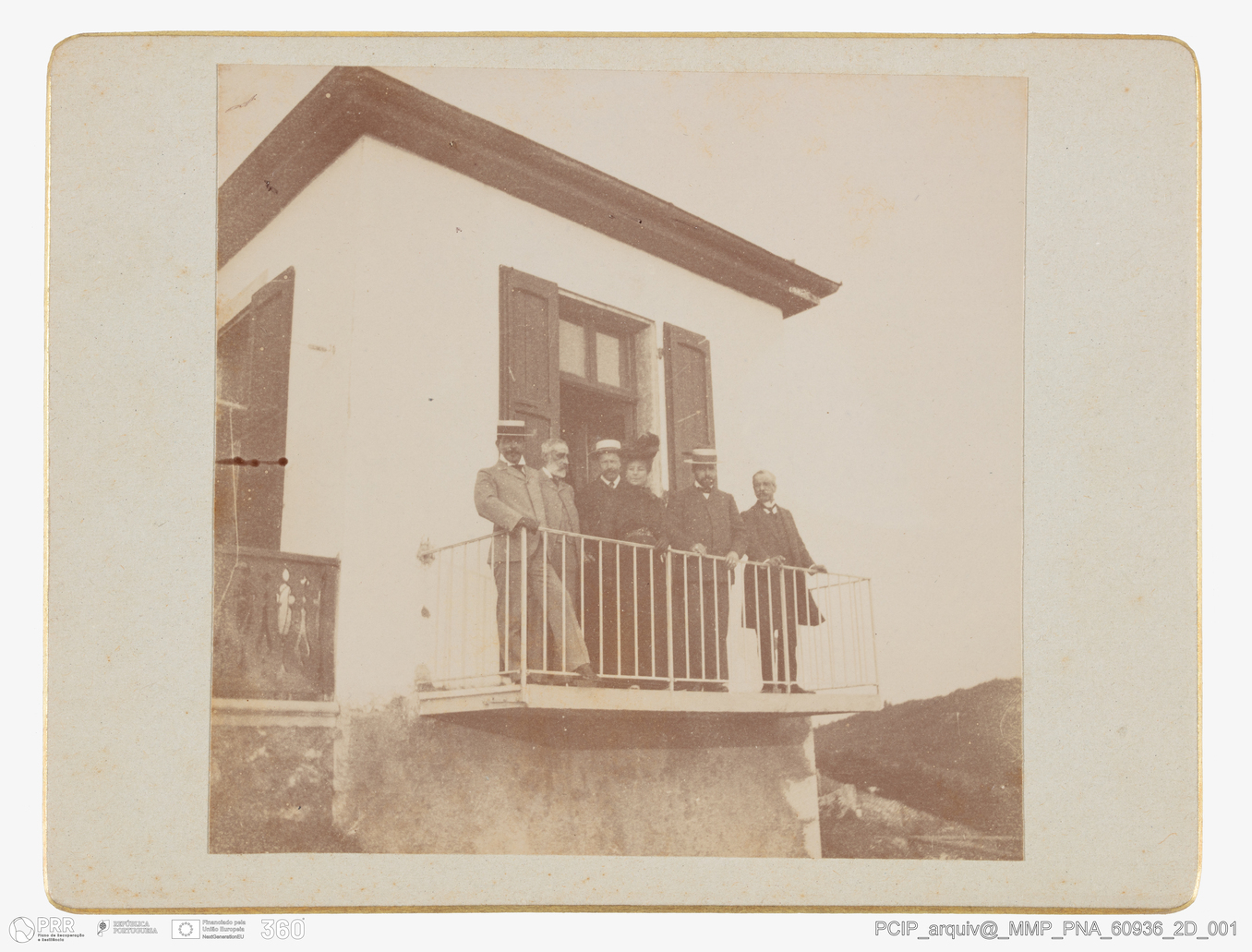 Documento simples. PNA_60936_2D_001 - Fotografia - Paisagem / Retrato - Viagens Reais – comitiva /casa com varanda onde se encontra a comitiva
