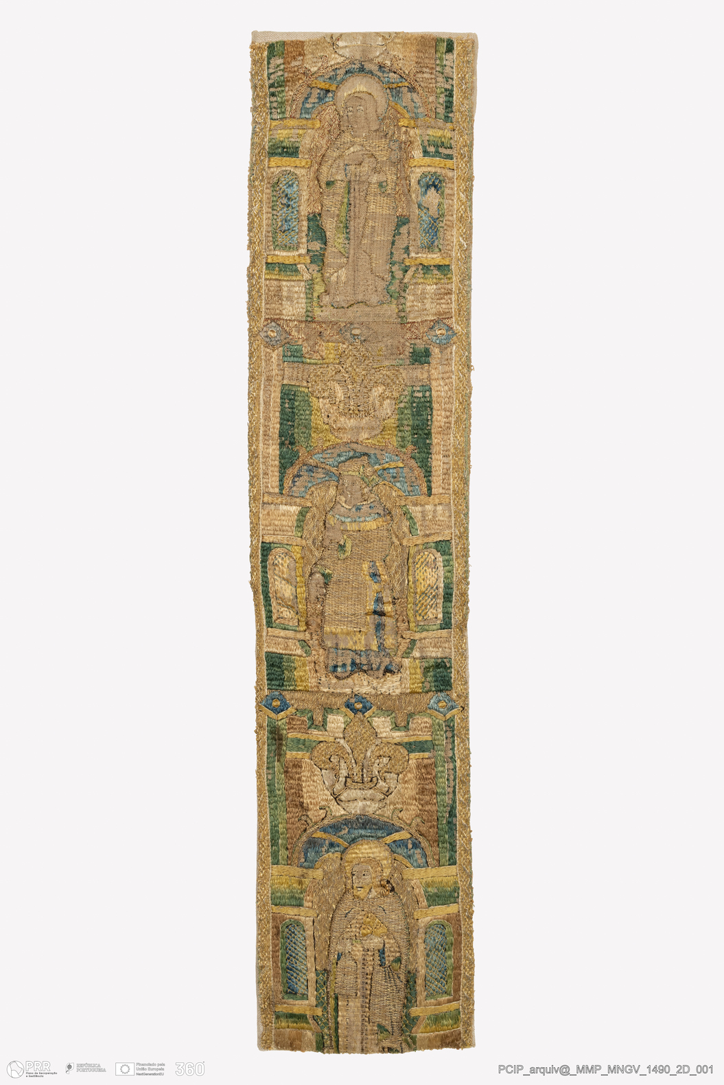 Matéria/Técnica: Bordado direto e bordado de aplicação; ponto de ouro, ouro estendido pouco denso ouro com relevo; seda matizada ponto lançado, seda frouxa estendida sujeita a fio de seda; Cronologia: Desconhecida; Autoria: Desconhecida; Dimensões: Desconhecidas.