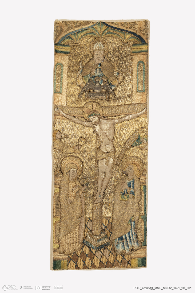 Matéria/Técnica: Bordado direto e bordado de aplicação; ponto de ouro e prata estendido, ouro com relevo; seda matizada, ponto fendido, ponto pena, ponto bolonha, seda froxa estendida sujeita por fio laminado dourado; efeitos de cordãozinho dourado e cordão de seda; efeitos de enchimento; Cronologia: Desconhecida; Autoria: Desconhecida; Dimensões: Desconhecidas.