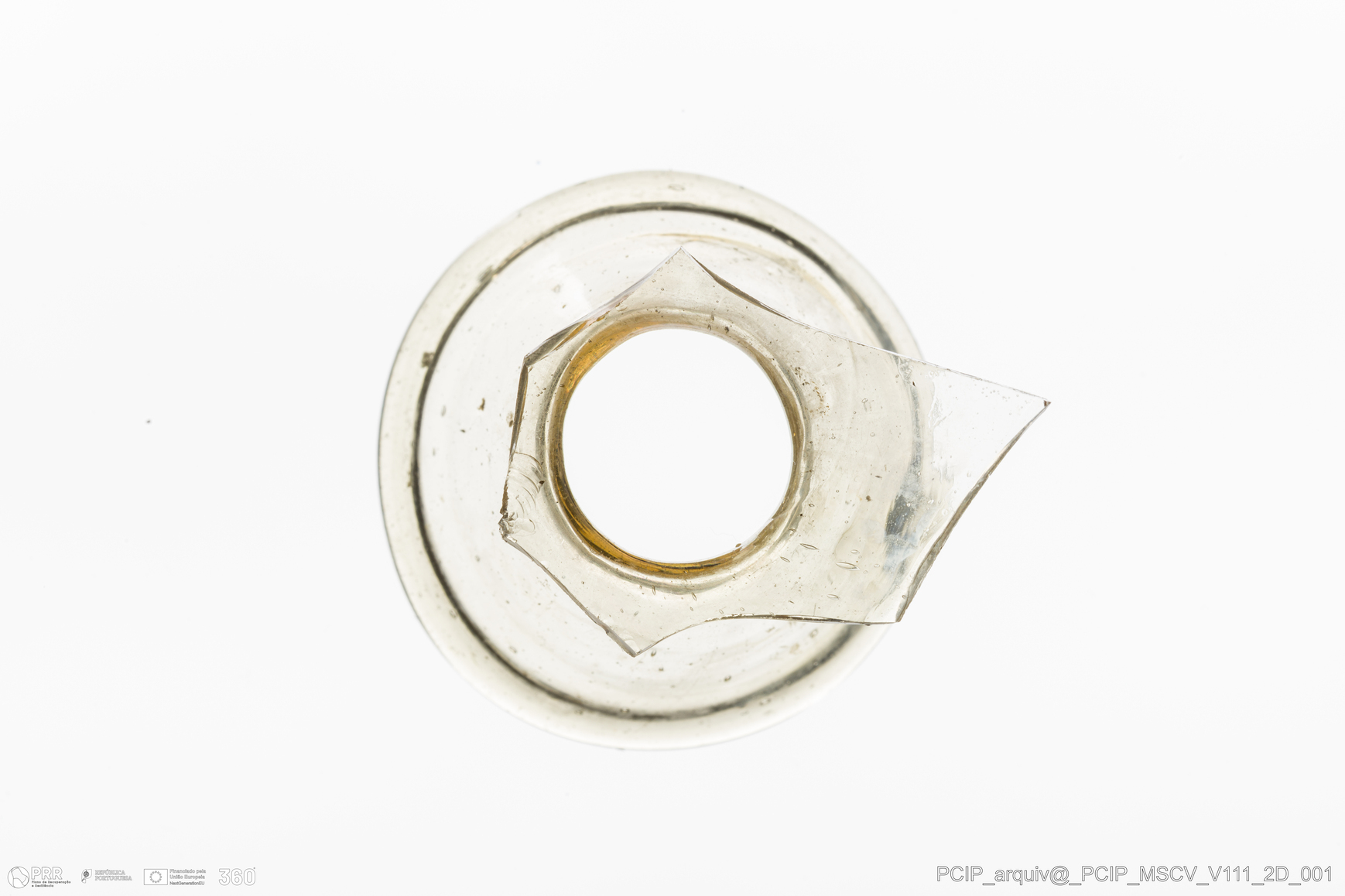Matéria/Técnica: Vidro; Cronologia: Século XVII; Autoria: Desconhecida; Dimensões: Diâmetro bordo: 32mm.