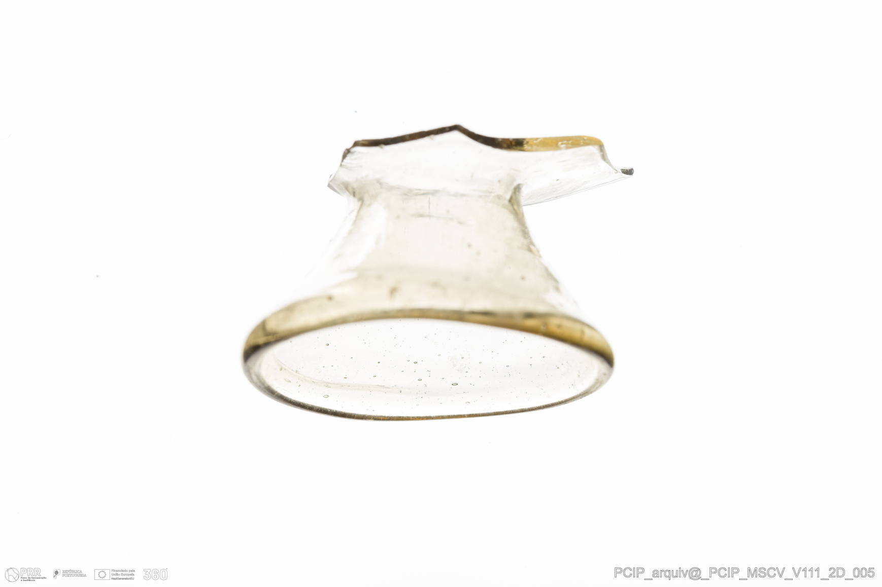 Matéria/Técnica: Vidro; Cronologia: Século XVII; Autoria: Desconhecida; Dimensões: Diâmetro bordo: 32mm.