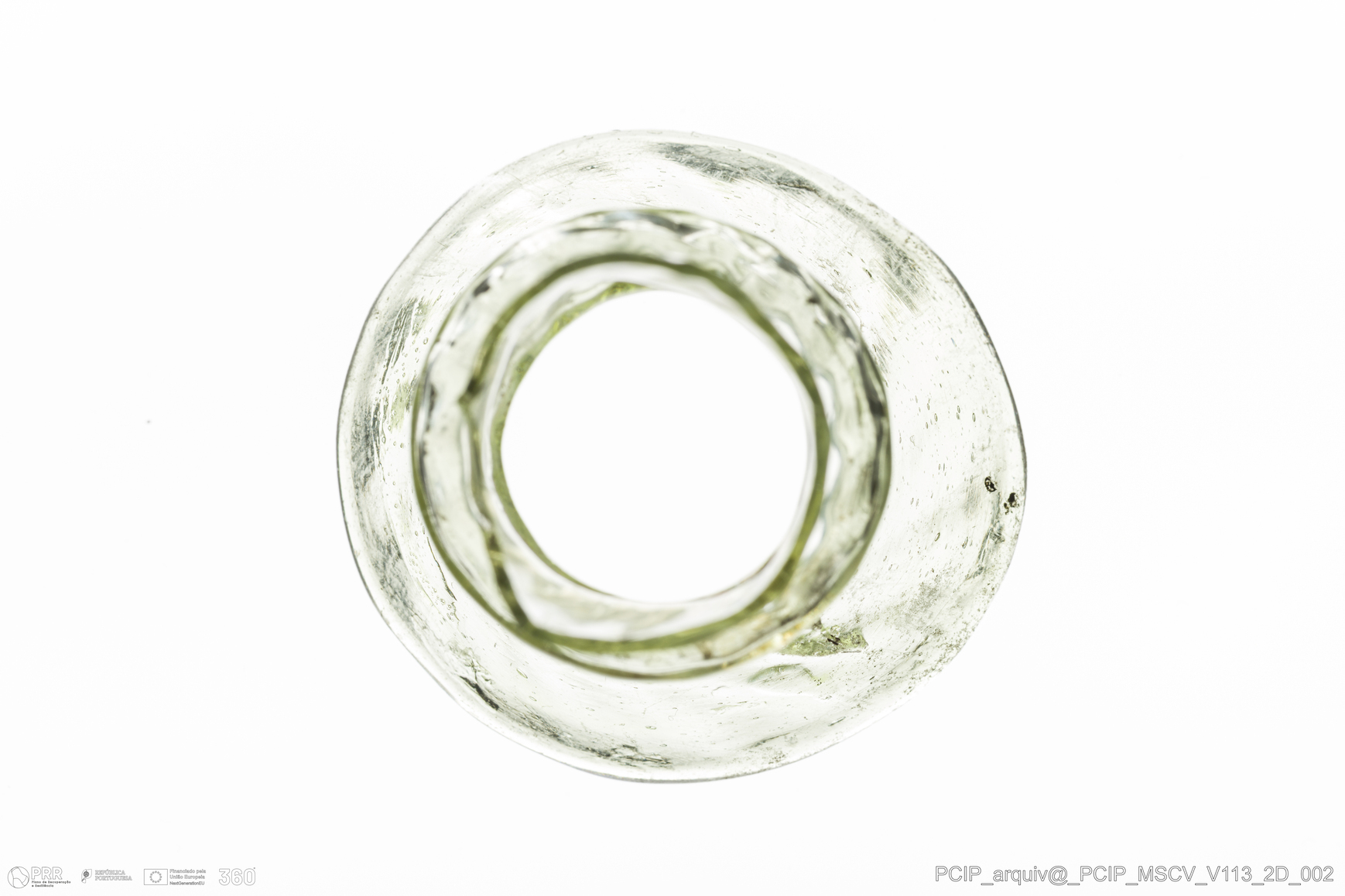 Matéria/Técnica: Vidro; Cronologia: Século XVII; Autoria: Desconhecida; Dimensões: Diâmetro bordo: 38mm.