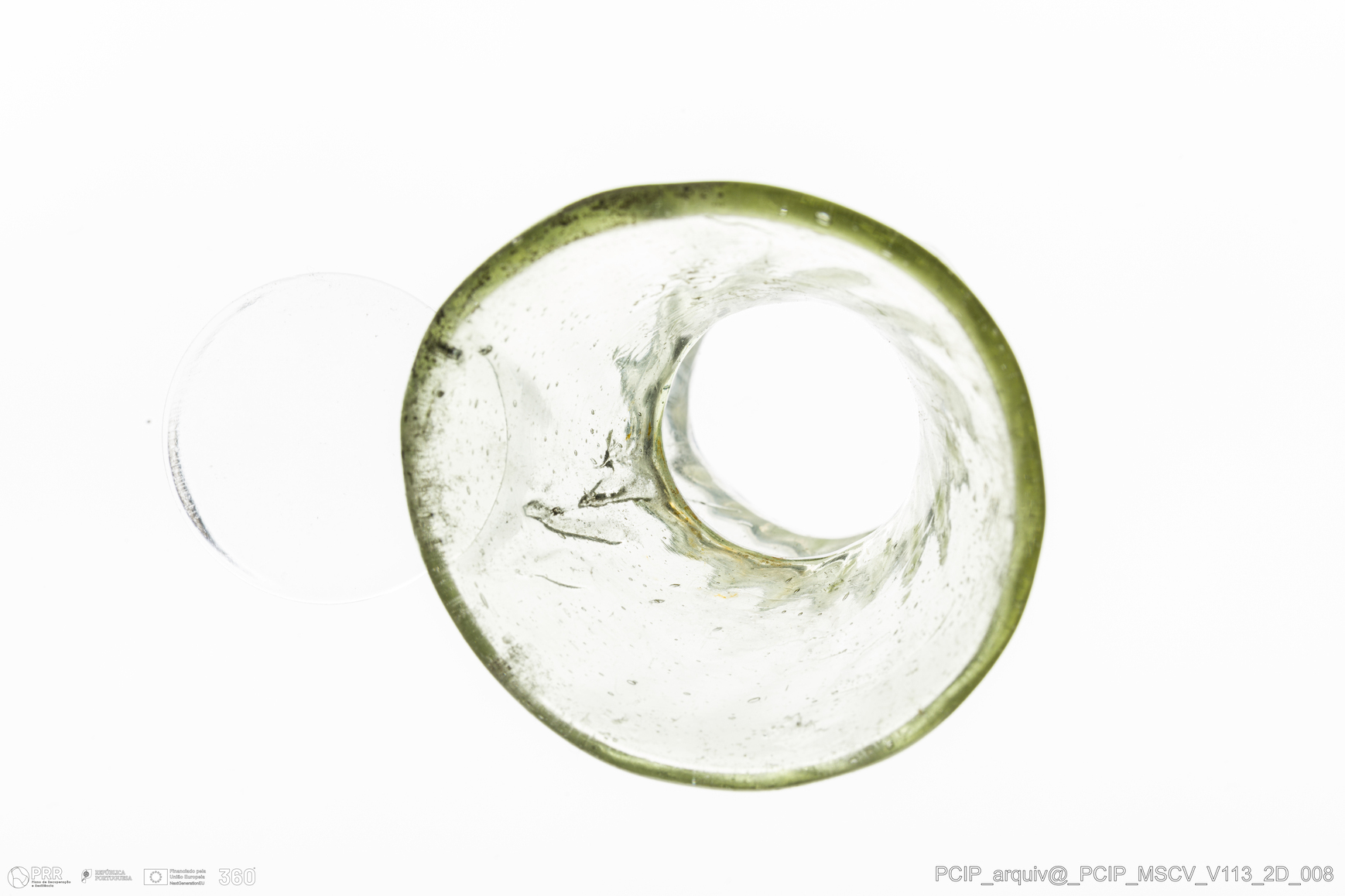 Matéria/Técnica: Vidro; Cronologia: Século XVII; Autoria: Desconhecida; Dimensões: Diâmetro bordo: 38mm.