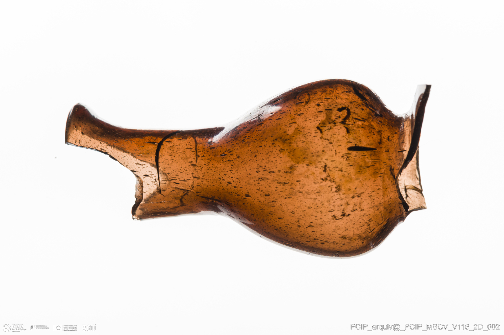 Matéria/Técnica: Vidro; Cronologia: Século XVII; Autoria: Desconhecida; Dimensões: Diâmetro bordo: 20mm.