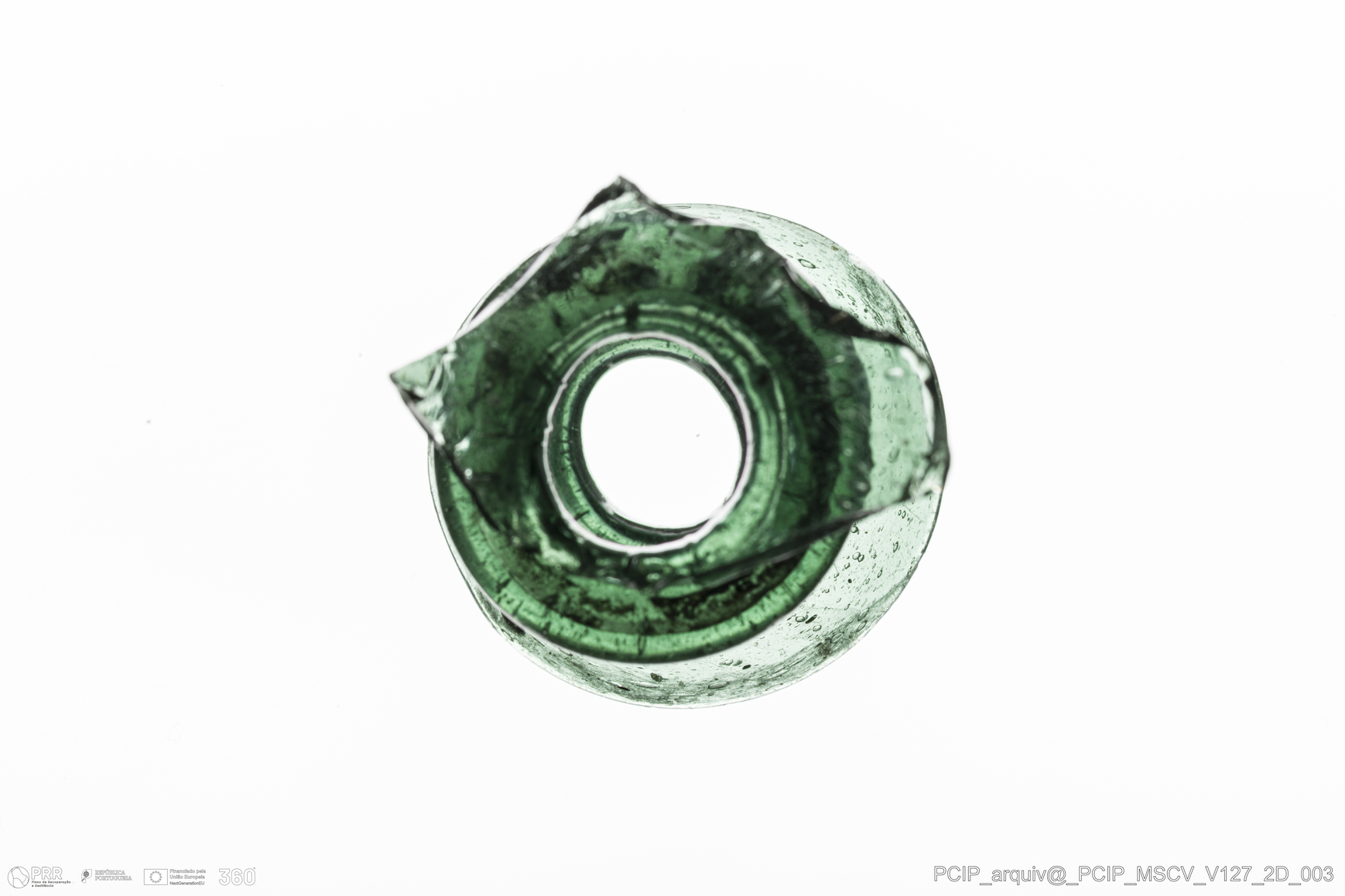 Matéria/Técnica: Vidro; Cronologia: Século XVII; Autoria: Desconhecida; Dimensões: Diâmetro bordo: 29mm.