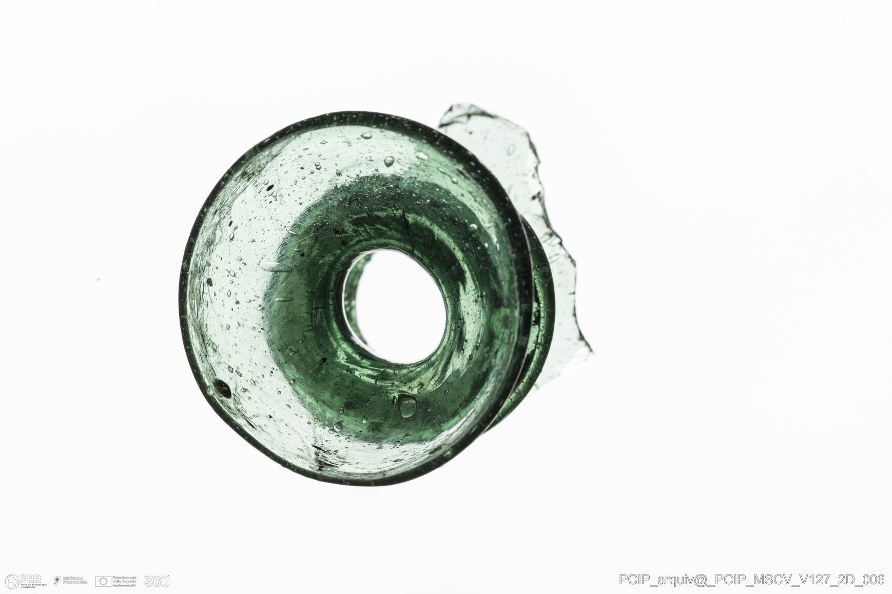 Matéria/Técnica: Vidro; Cronologia: Século XVII; Autoria: Desconhecida; Dimensões: Diâmetro bordo: 29mm.