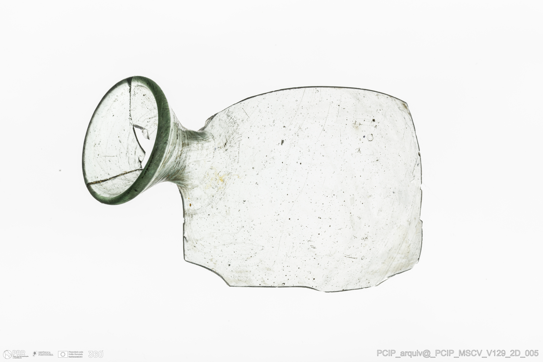Matéria/Técnica: Vidro; Cronologia: Século XVII; Autoria: Desconhecida; Dimensões: Diâmetro bordo: 29mm.