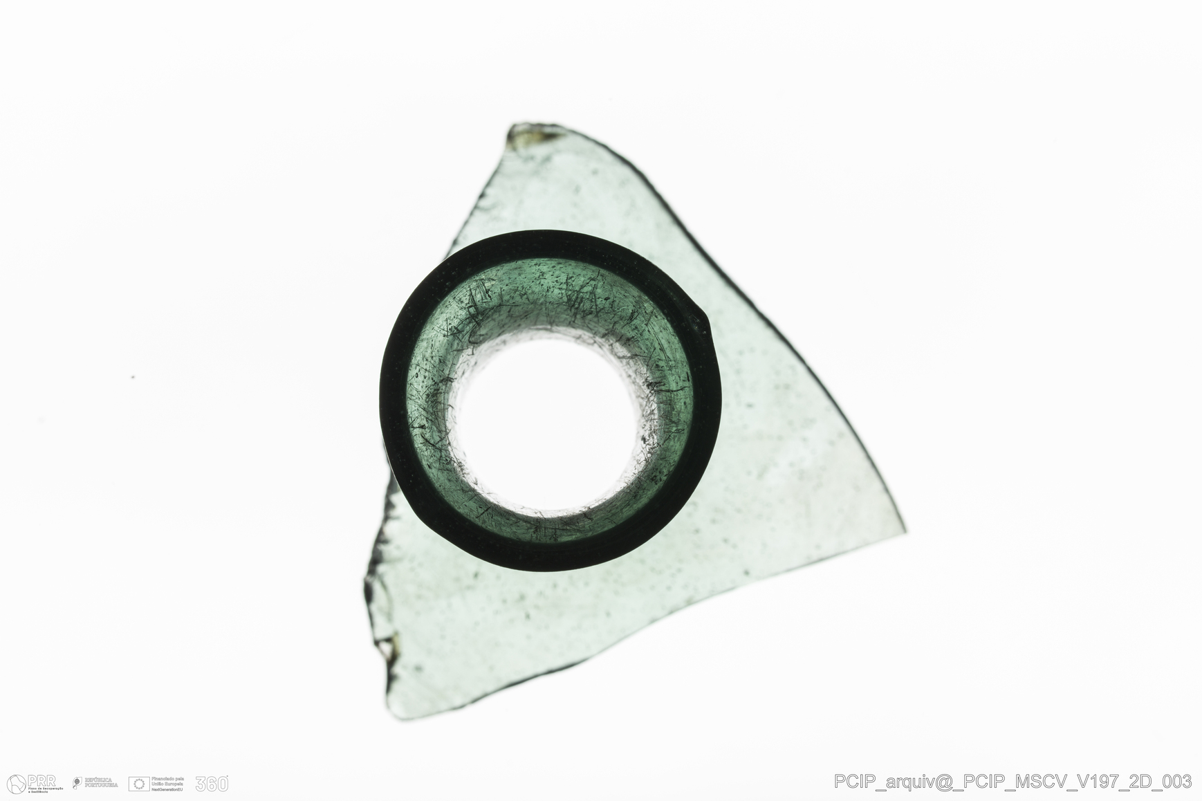 Matéria/Técnica: Vidro; Cronologia: Século XVII; Autoria: Desconhecida; Dimensões: Diâmetro bordo: 27mm.