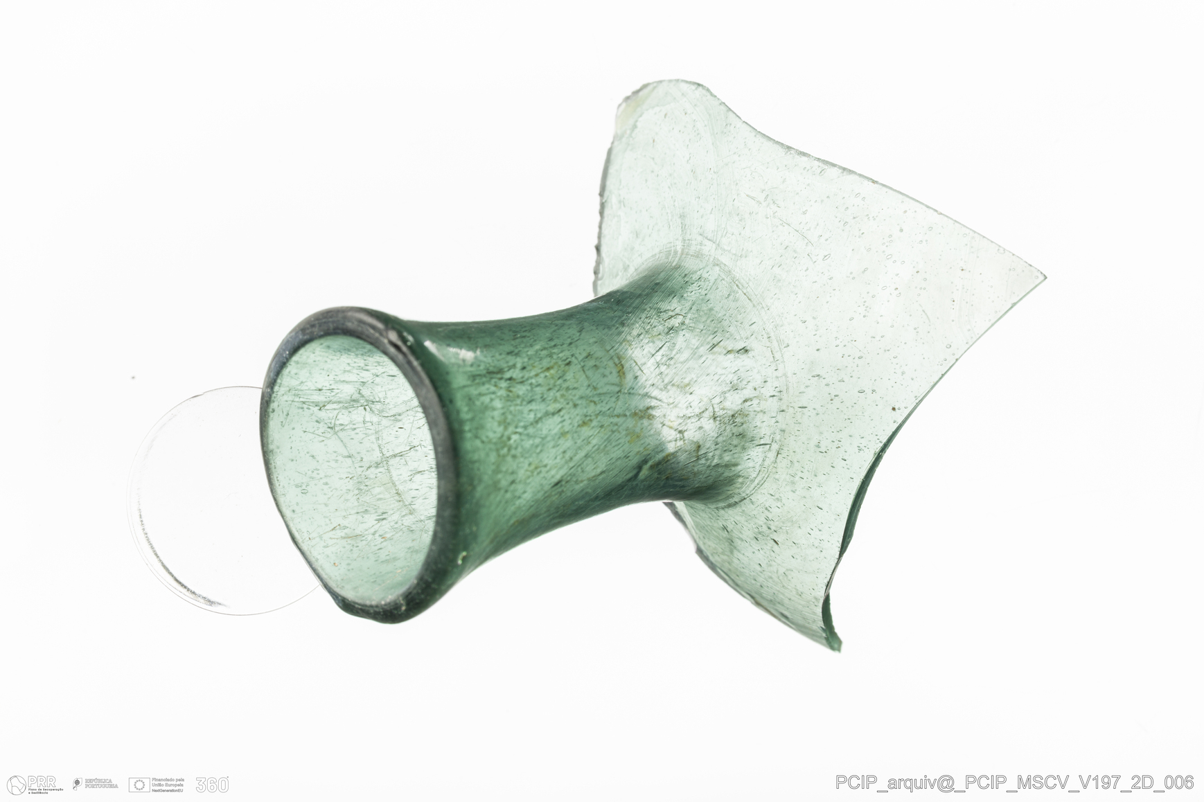 Matéria/Técnica: Vidro; Cronologia: Século XVII; Autoria: Desconhecida; Dimensões: Diâmetro bordo: 27mm.