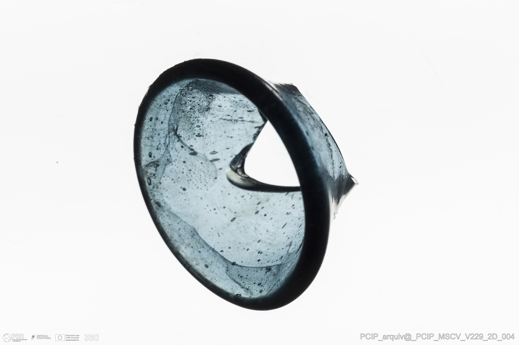 Matéria/Técnica: Vidro; Cronologia: Século XVII; Autoria: Desconhecida; Dimensões: Diâmetro bordo: 28mm.